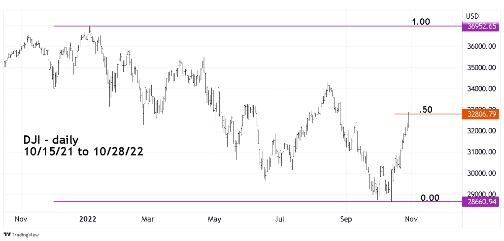 At the 10/28/22 high the DJI had retraced 51% of its 2022 decline. After looking at this chart it’s not so far fetched to think this index could make a new high in 2023. Also, November is seasonally the most bullish months for stocks. With November beginning next week its possible the DJI could make a new high before the end of 2022.