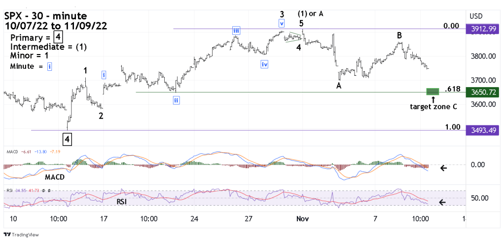 The decline from the 11/01/22 top looks like a developing Zigzag correction. If so, it could complete near the 3,650 area which is also the termination point of the presumed Minute wave ‘ii’ of Minor wave “3”.