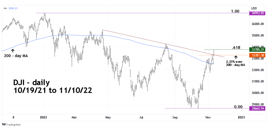 At the close of the 11/10/22 session the DJI was just below the Fibonacci .618 retracement of the 2022 bear move.