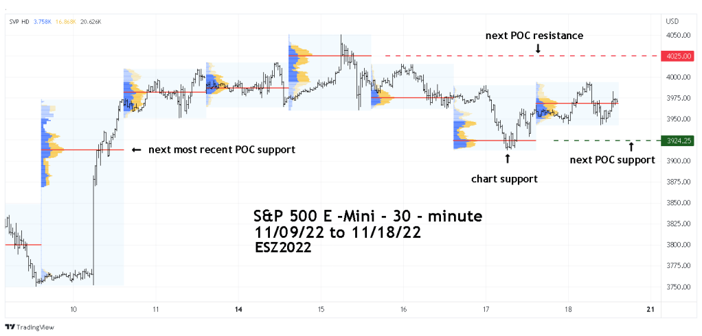 What about the next support area? Normally the POC from the current session could be support/resistance. However, note that at the close of the main session on 11/18/22 the price was only slightly above the POC. Price will either move away from or moves towards POC. If on 11/21/22 price is below the 11/18/22 POC, support could be at the next most recent POC, which in this case is at 3,925.00 from the 11/17/22 session.