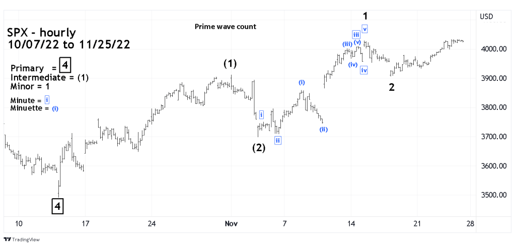 The SPX could be forming a series of “one’s” and “two’s” up from the 10/13/22 bottom. This sequence is usually the set up for a very dynamic movement in the primary trend – in this case up. An example of a series of “one’s” and “two’s” up is shown on the chart. Note the action after the presumed Intermediate wave (2) bottom. Also note the dynamic move up after the presumed Minuette wave (ii) bottom.