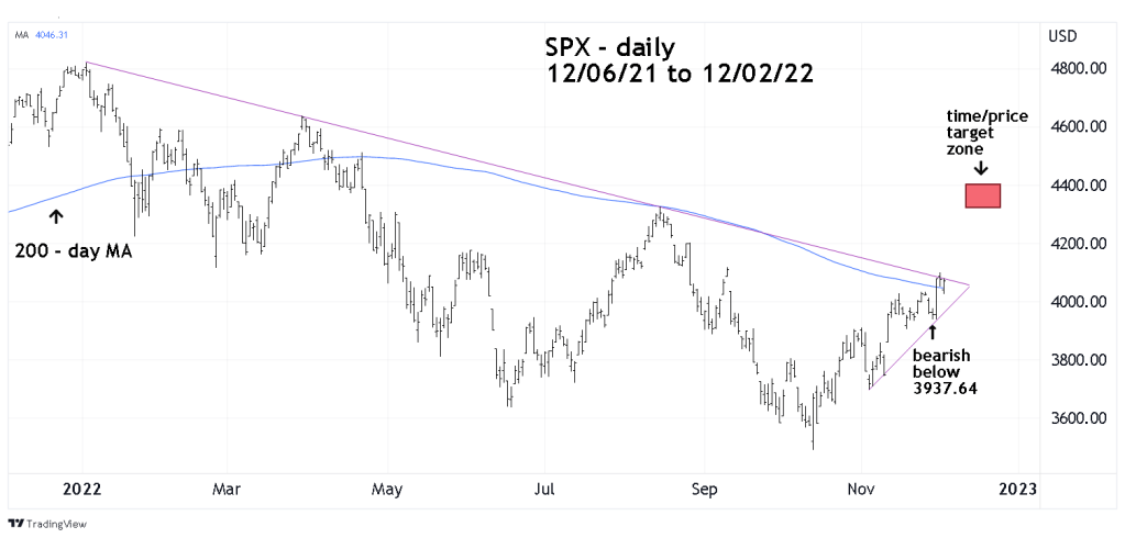The broad time zone for a potential top is from 12/12/22 to 12/23/22. The next FOMC meeting/announcement is on 12/14/22, sometimes significant stock market turns occur on FOMC announcements. If US stocks continue to rally after 12/14/22 the next new moon is on 12/23/22. Occasionally market trend changes come on or near new/full moons. For stock markets new moons tend to signal tops.