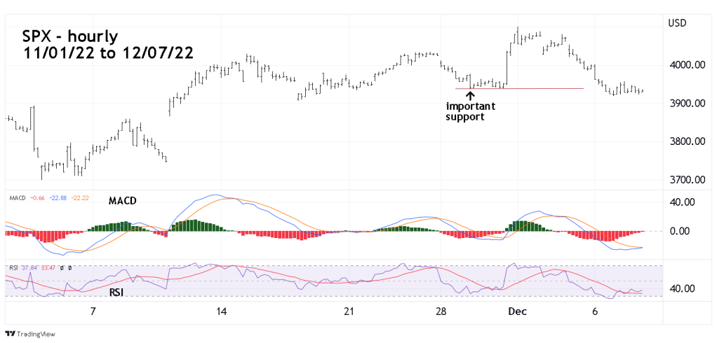 On 12/06/22 the hourly RSI and MACD reached levels that indicate the SPX may have made or is nearing a bottom. If on 12/08/22 the SPX moves below the bottom made on 12/06/22, the hourly RSI and/or the MACD could have bullish divergences.