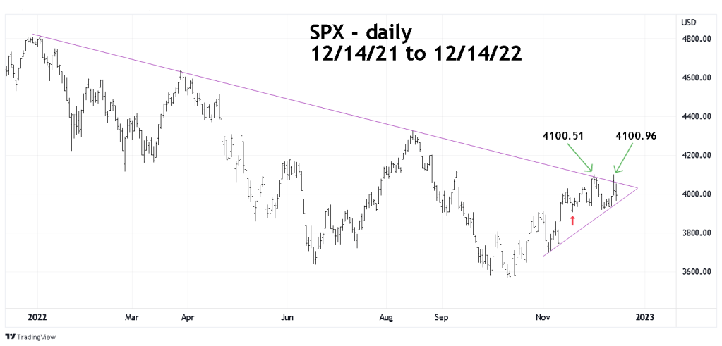 The daily SPX chart courtesy of Trading View illustrates price action from 12/14/21 to 12/14/22.
