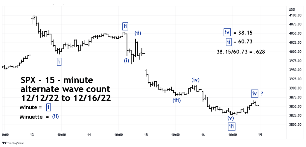 Within the first ten – minutes of the S&P 500 (SPX) session on 12/16/22 there were two bottoms made. The first was at almost exactly 3,868.18 which was Fibonacci support noted in this websites prior blog. The second bottom was at 3,863.74. Subsequently there was a rally that lasted ten – minutes, the SPX then declined below 3,863.74 which was a major clue that the SPX could be headed down to the next significant Fibonacci support zone.