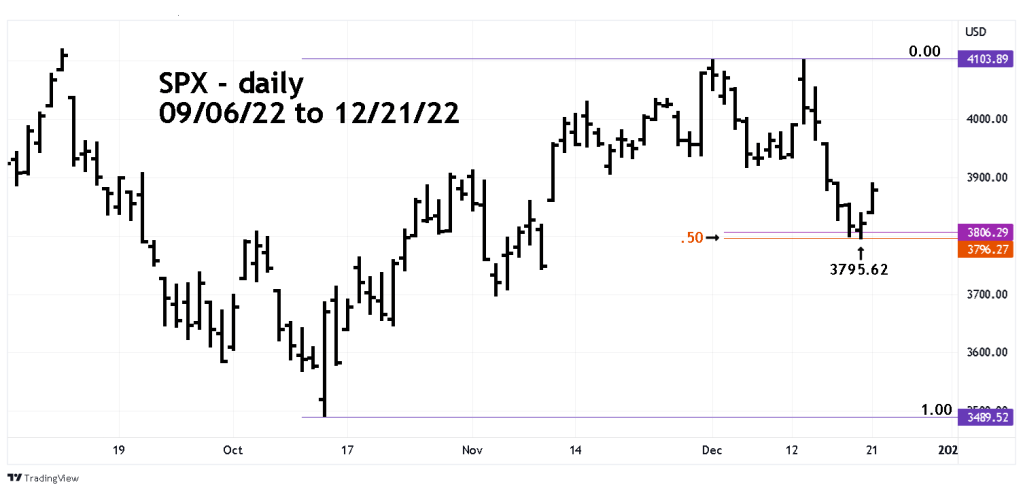 An exact Fibonacci .50 retracement of the SPX October to December rally is at 3,796.27. The bottom early in the trading session on 12/20/22 was 3,795.62 almost a bulls eye hit!