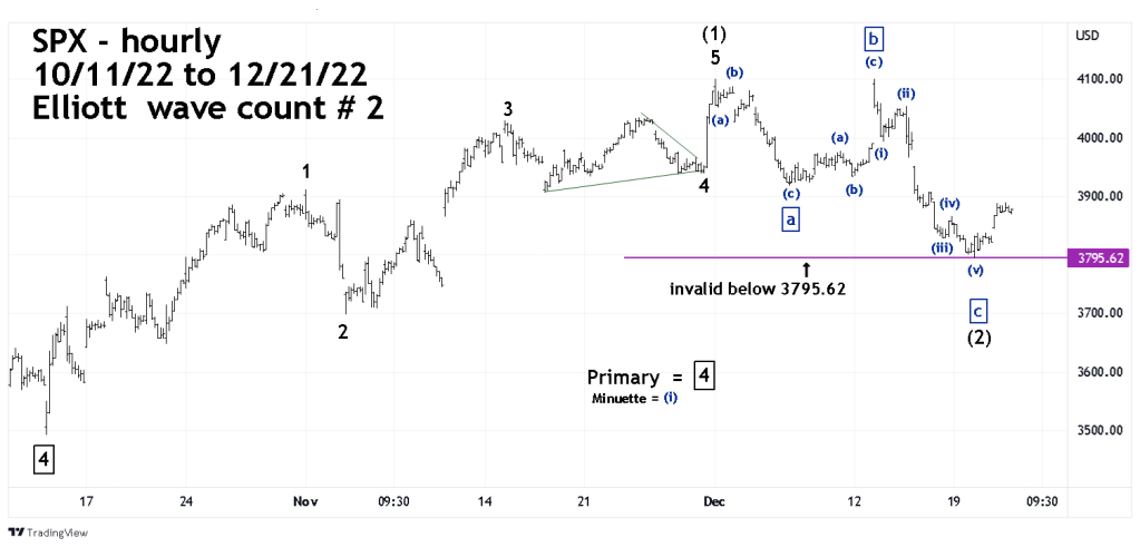 Prior blogs on this website have noted that the SPX decline from the 12/13/22 top looked to be a developing Elliott Impulse wave. It appears a five – wave count completed at the 12/20/22 bottom. If so, the move down from 12/13/22 to 12/20/22 could be partially retraced. Second waves usually retrace about 50% to 61.8% of the first motive patten, in this case the move from 4,100 to 3,795.