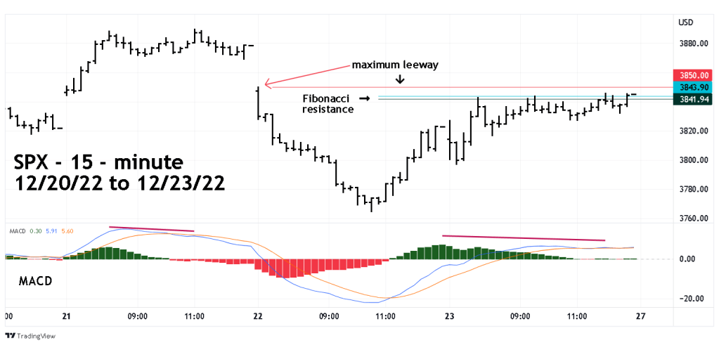 Markets are attracted to Fibonacci resistance/support areas. This websites 12/22/22 blog noted two S&P 500 (SPX) Fibonacci retracement points. At SPX 3,841.94 and 3,843.90, this resistance was reached on 12/23/22.