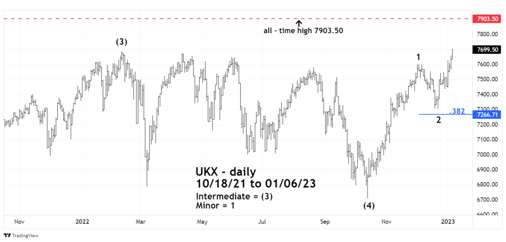 The UKX October to December rally could be the first wave of a developing Elliott impulse pattern. Normally for stocks the third wave of an impulse pattern is the longest. Considering the length of the presumed first wave its possible it could be the longest. In those situations, the third wave is usually slightly shorter than the first wave. Assuming the 12/20/22 bottom is wave “two”, a possible top for wave “three” – based on price is in the 8,180 area. Based on the percentage growth of wave “one”, wave “three could reach 8,260. These targets will be explained in greater detail assuming the UKX rally continues.