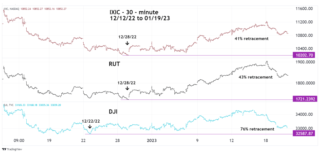 On 01/19/23 the SPX bottomed out just below a 50% retracement of its 12/22/22 to 01/17/23 rally. On 01/19/23 the DJI, which also had a rally after 12/22/22 retraced 76% of that rally.
