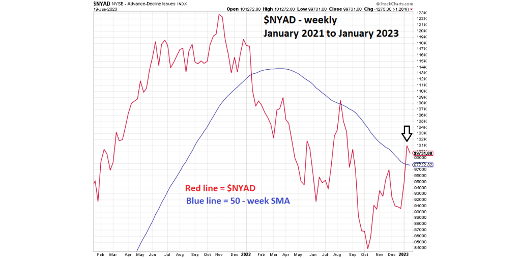 The $NYAD is still above its 50 – week Simple Moving Average (SMA). A move below this line could mean that an important top was made on 01/17/23.