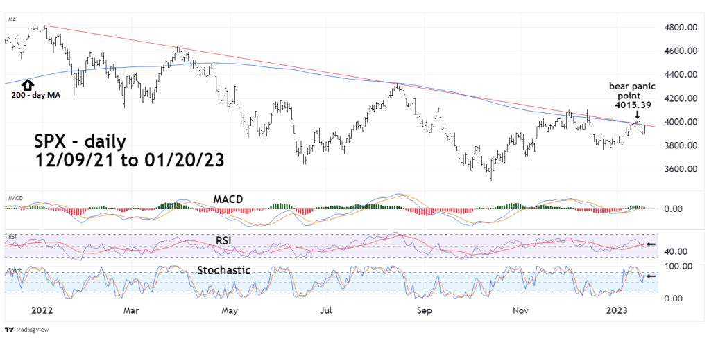 As of 01/20/23 the SPX – 200 – day moving average (MA) and the declining trendline from January 2022 were at the same level. The SPX high and close for the session were marginally above the 200-day MA. It’s possible the recent peak at 4,015.39 could be the new bear panic point. A move over 4,015.39 may trigger short covering and bring in additional long side trades.