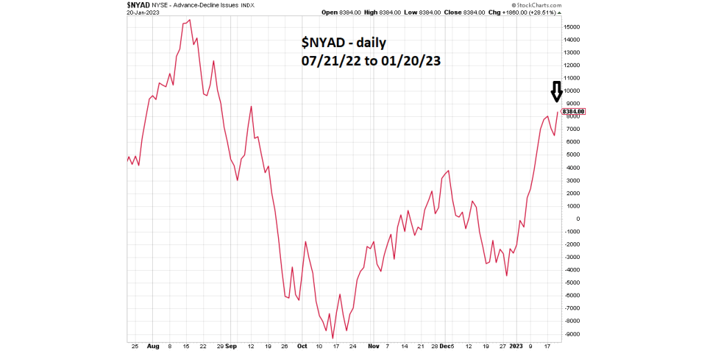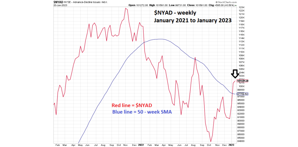 The 01/19/23 blog noted that if $NYAD moved below its 50-week Simple Moving Average (SMA) it could mean an important top was made on 01/17/23. The weekly $NYAD is now moving up.