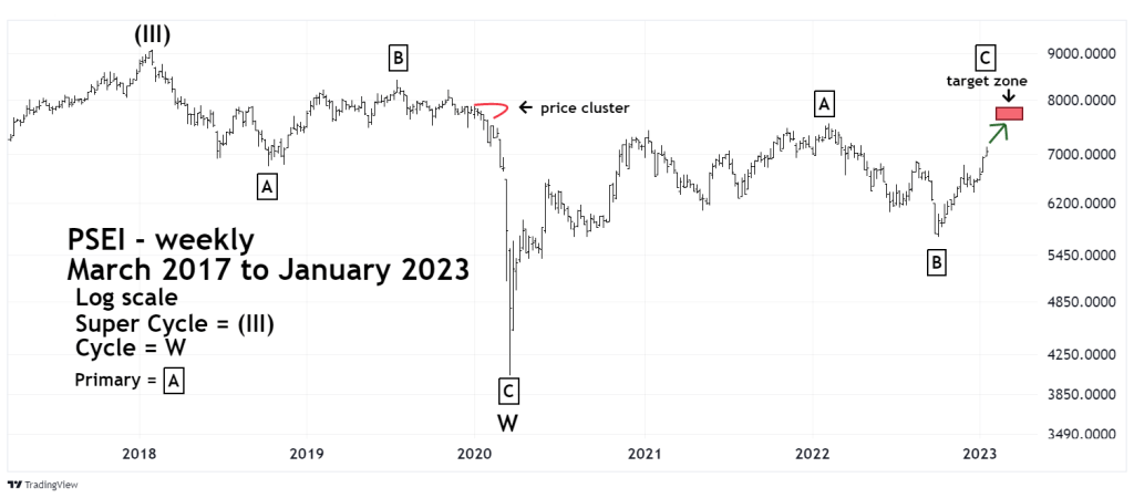 The PSEI bull move from the March 2020 crash bottom could be just the middle part of a large multi- year bear market that began at the all-time high in January 2018. If so the current bull phase may not make a new- all-time. A logical area for the next significant top is between 7,600 and 7,900. This zone corresponds with price cluster formed in December 2019 and January 2020.
