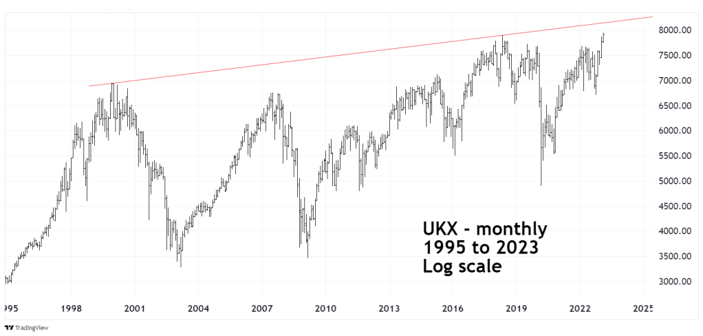 The monthly UKX chart courtesy of Trading View examines the long – term view.