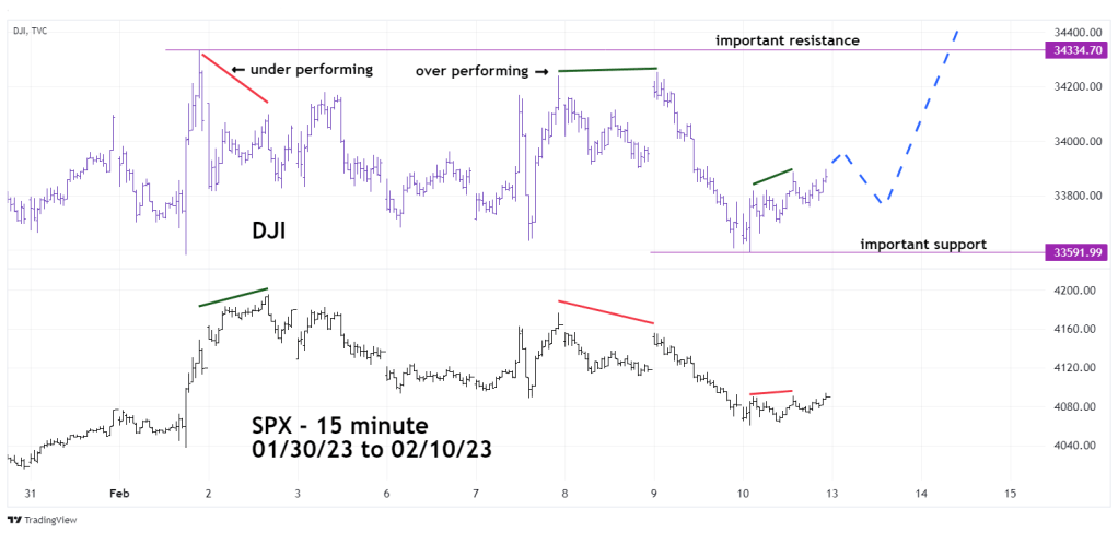 The DJI and SPX – 15 – minute chart courtesy of Trading View compares their recent performance.