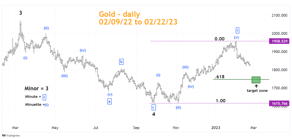 The prior two blogs examined the long and intermediate – term Elliott wave counts for Gold. The focus now shifts to the Elliott wave action from March 2022 to February 2023.