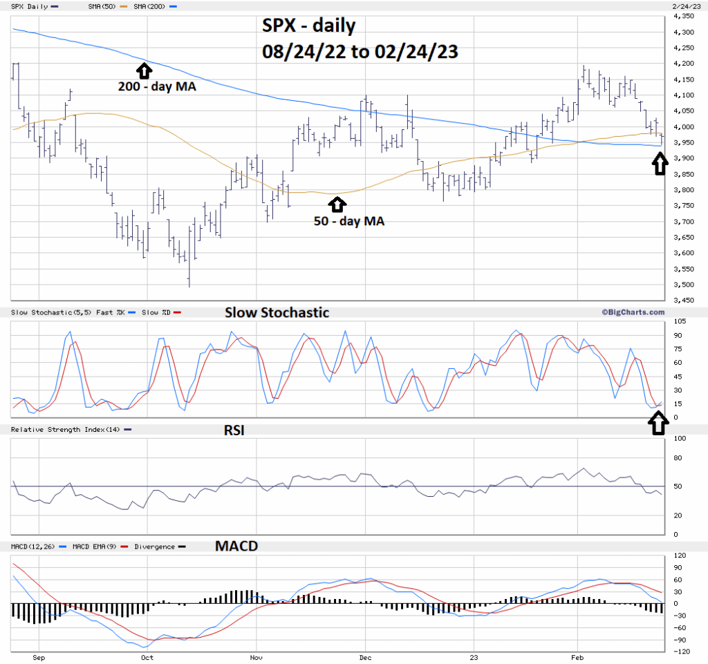 Shortly after the SPX opening on 02/24/23 it reached the 200 – day moving average (MA) triggering a rally that continued throughout the session. Daily Slow Stochastic has a bullish lines cross in the oversold zone. RSI is in the neutral zone with no bullish divergence. Daily MACD is trending lower, and the lines are still above the zero – level. The combined evidence of the three momentum oscillators hint at more downside action.