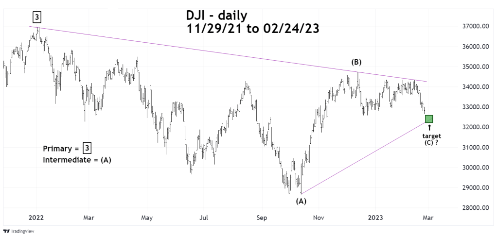 Prior blogs on this site have noted that the DJI from it’s all-time high in January 2022 could be forming an Elliott wave – Horizontal Triangle. Its possible this structure could still be forming with the decline from 12/13/22 top as a developing wave ( C ). If so the size of the presumed wave ( C ) would be proportionate to the presumed waves ( A ) and ( B ).
