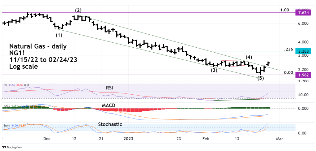 The daily Natural Gas chart (NG1!) courtesy of Trading View illustrates the action since November 2022.