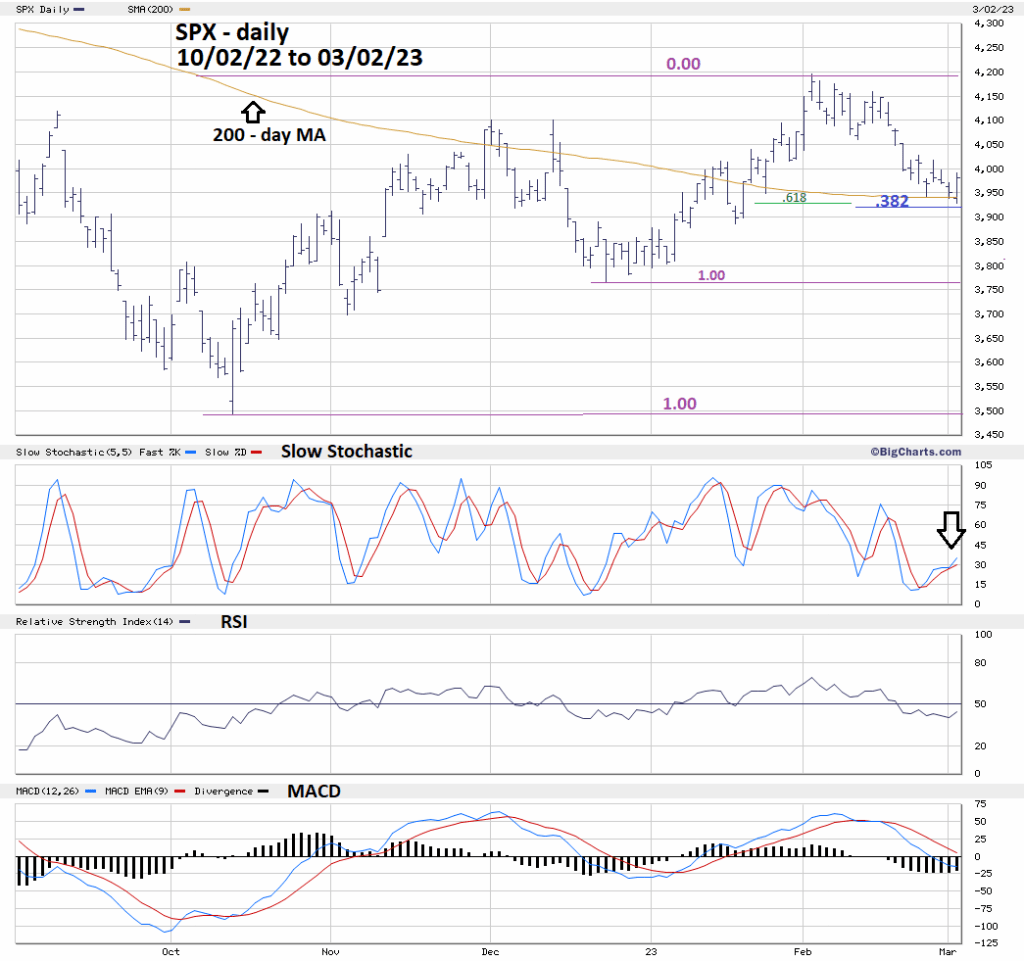 The SPX made a bottom early in the 03/02/23 session. What makes this exciting is that the bottom was in the area of the SPX – 200 – day moving average (MA) and Fibonacci support.