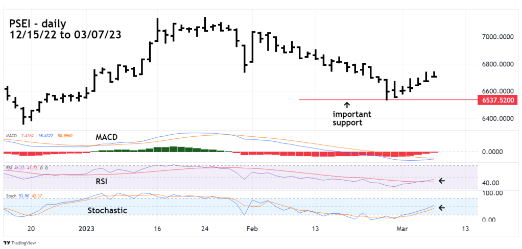 Daily MACD is rising yet still does not have a bullish lines crossover. If the PSEI rises on 03/08/23 there could be a bullish lines crossover. If this were to occur it could be a very significant bullish signal for the PSEI and other national stock indices.