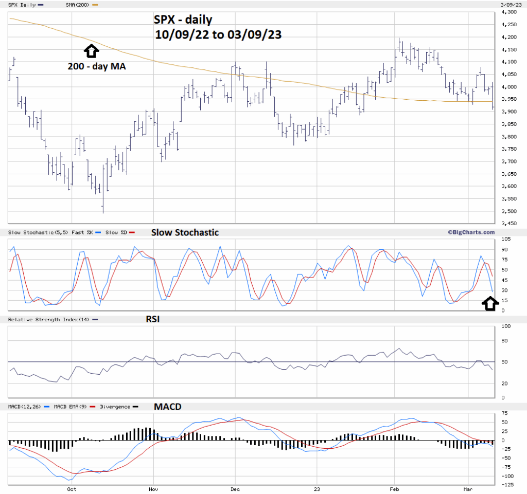 The blog “Move Up From Important Support – 03/02/23” noted the S&P 500 (SPX) rallied after it reached the area of two Fibonacci support levels and the 200 – day moving average (MA). Today 03/09/23 the SPX broke and closed the session below this important support. This break opens the door for more downside action.