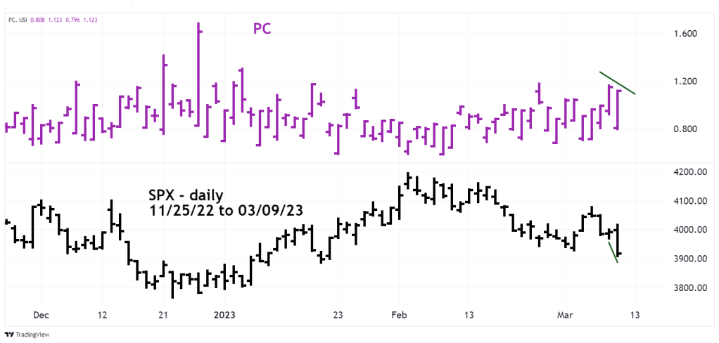 Today 03/09/23 PC never went above the 1.15 level and closed the session lower than its 03/08/23 close with the SPX at lower prices. This could mean that fear is subsiding – a bullish sentiment divergence. However, if there’s more fear PC could move a lot higher.