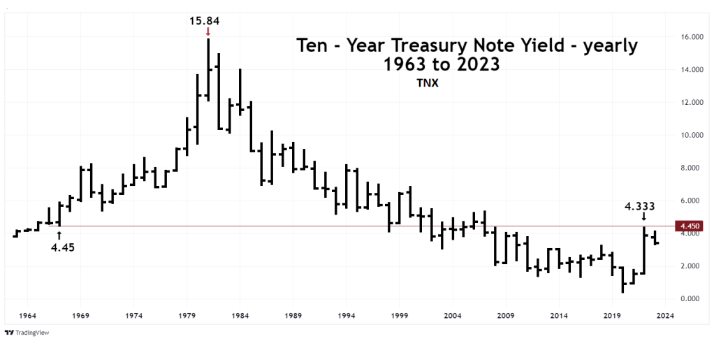 The yearly Ten – Year U.S. Treasury Note yield (TNX) chart courtesy of Trading View illustrates its history since 1963.