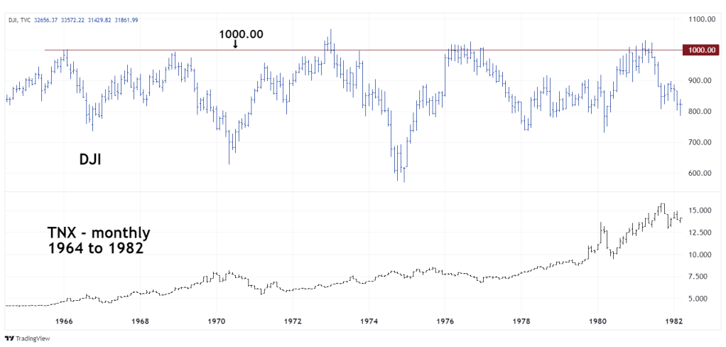 The monthly Dow Jones Industrial Average (DJI) and TNX chart illustrates their relationship from 1964 to 1982.