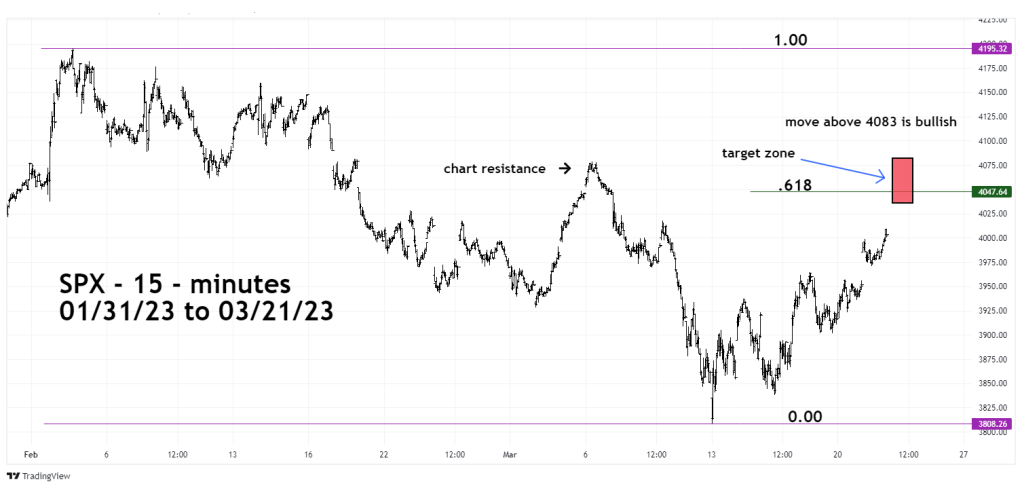 An SPX move above .618 Fibonacci and chart resistance could trigger a rally until late April/early May 2023 – the end of stocks bullish season.