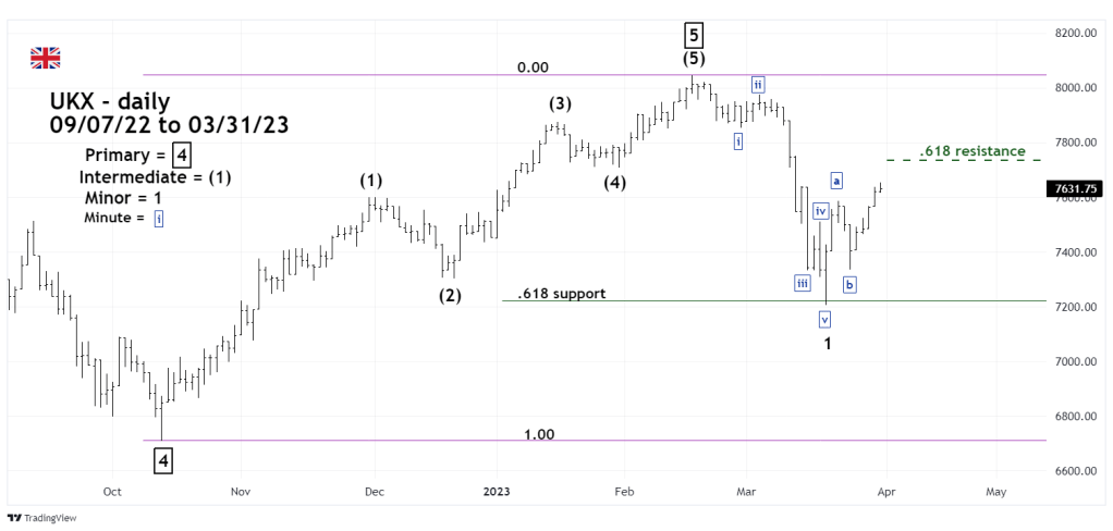 The 03/13/23 blog “Major UK 100 Top is Probably in Place” noted that from October 2022 to February 2023 the UKX had a clear Elliott – five wave Impulse pattern. Subsequently the UKX decline 10% bottoming almost exactly at a Fibonacci .618 retracement of the October to February rally.