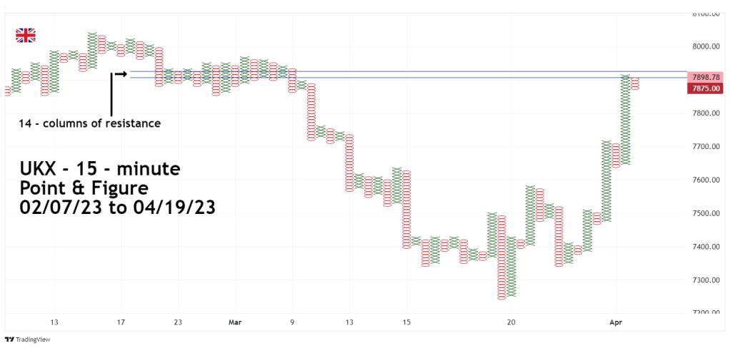The 15-minute UKX – Point & Figure chart gives greater clarity to the potential resistance zone.