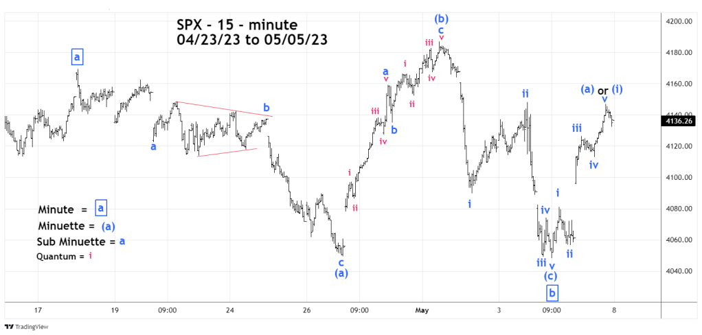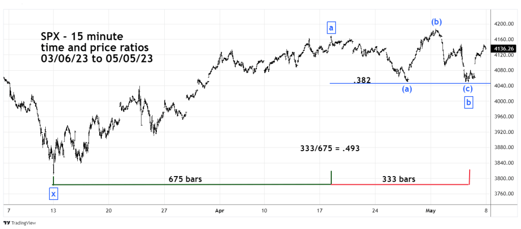 The rally from 03/13/23 to the Minute wave “a” top was 675 – 15 – minute bars. The subsequent Expanding Flat took 333 – 15 – minute bars. The ratio of 333/675 is .493 very close to the Fibonacci ratio of .50.