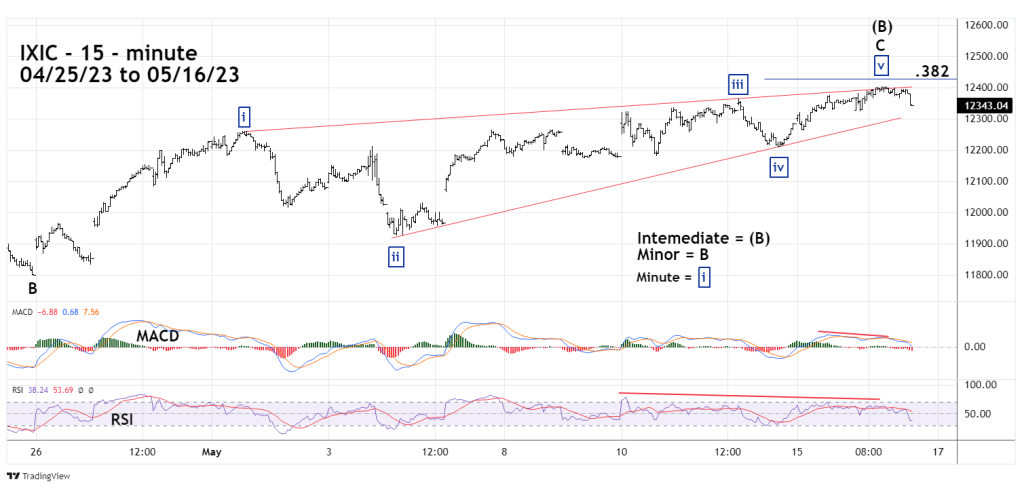 The 15 – minute IXIC chart courtesy of Trading View updates the Elliott wave count.