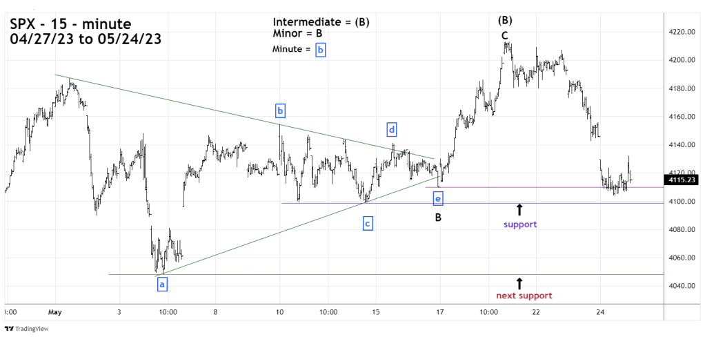 The SPX drop from its 05/19/23 top appears to be a developing Elliott impulse wave and today, 05/24/23 broke below the 05/16/23 bottom at 4,109.86. This level appears to be the point of origin of a post Elliott wave – Horizontal Triangle thrust up. The break below 4,109.86 also completely retraced a five-wave impulse pattern, invalidating what could have been the first wave up of a larger developing five wave formation.