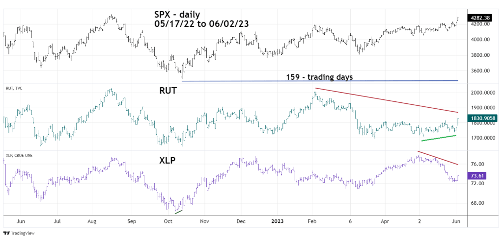 The next SPX, RUT, and XLP chart examines the bull phase after mid – October 2022.