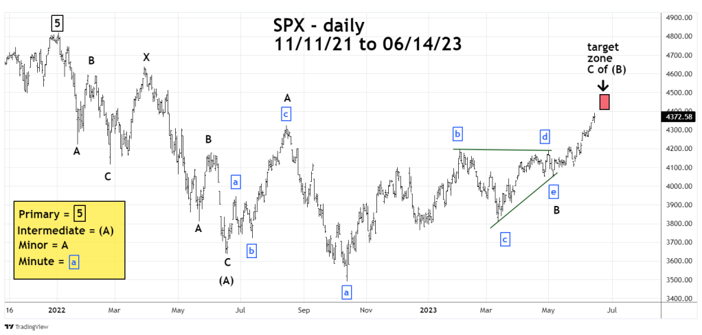 Typically, after a Horizontal Triangle there’s a thrust in the direction of the current main trend. The strong persistent move up from the SPX 05/04/23 bottom looks like a thrust. If this wave count is correct a near-term decline could be brief – perhaps only one or two trading days, followed by a terminal move up.