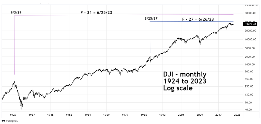 The monthly DJI chart courtesy of Trading View is a reproduction of the June 2023 forecast illustrated in Chapter 10 of “The Spiral Calendar.”