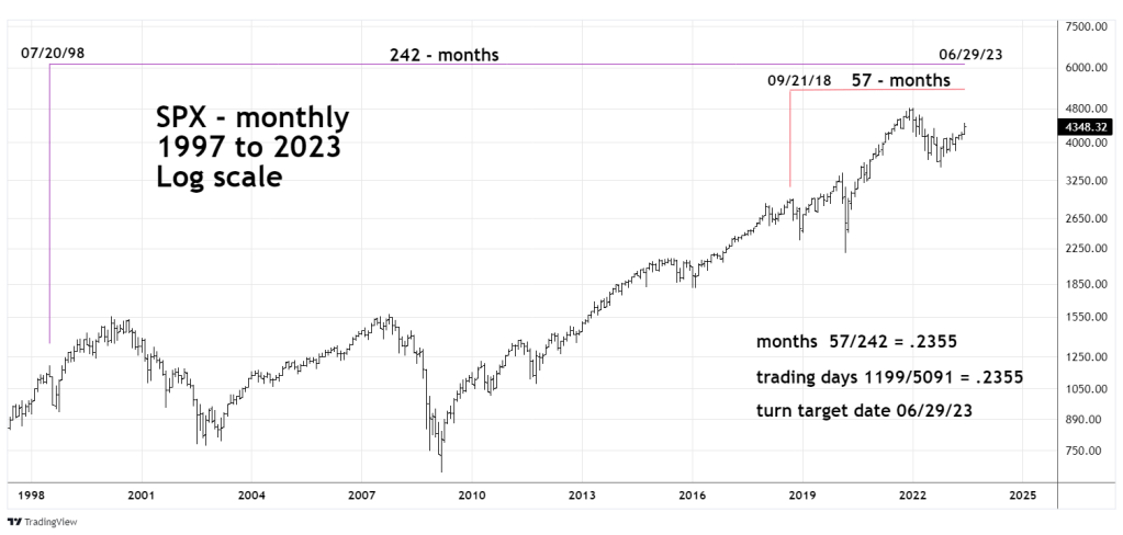 The monthly time ratio is .2355 which is very close to the Fibonacci ratio of .236. Going down to the daily scale targets 06/29/23 as the bullseye date for a potential SPX turn.