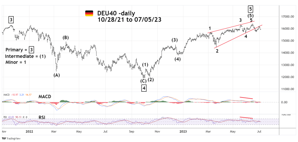 In mid – June 2023 the DEU40 made a new all-time high. The pattern up from September 2022 bottom counts as an Elliott – five wave Impulse. The movement from December 2022 labeled as Intermediate wave (5) is an Elliott wave – Ending Diagonal Triangle. These are termination patterns of the larger trend. Note the recent break below the rising lower trendline. The subsequent rally back to the trendline, then reversing is a classic example of prior support becoming resistance.
