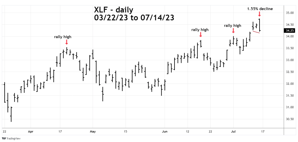 Notice what happened at each of the three prior post March 2023 rally highs. Now look at what happened on 07/14/23. XLF opened at a new rally high then fell 1.55% – a dramatic one-day reversal. Not only did XLF close the session below its prior day low, but it also went below the bottom on 07/12/23!