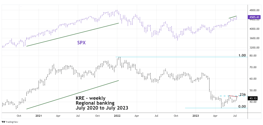 In July 2023 it is continuing to diverge with the SPX! Note that while the SPX has made a marginal new high in July, KRE is below its June peak!
