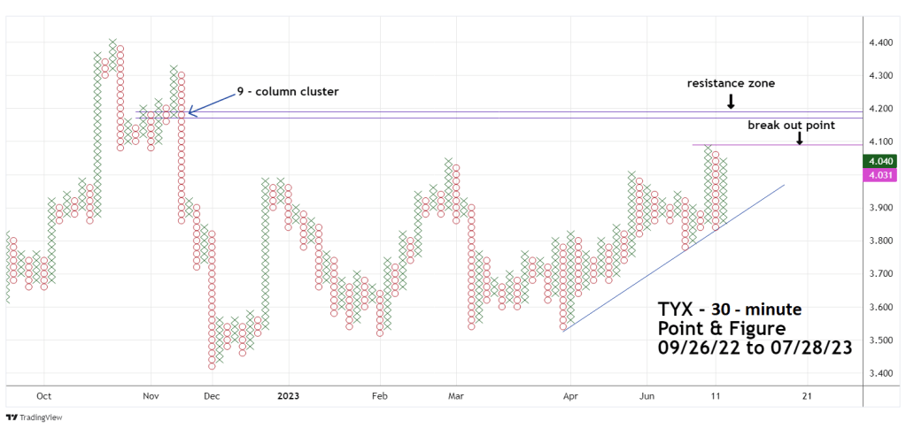 The 30 – minute TYX – Point & Figure chart courtesy of Trading View illustrates the battlefield since September 2022.