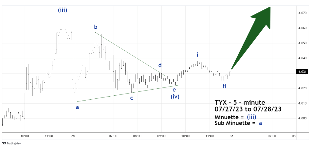The 07/27/23 blog illustrated that on the daily scale TYX may have completed an Elliott wave Horizontal Triangle and was in the early phase of a rising impulse wave.