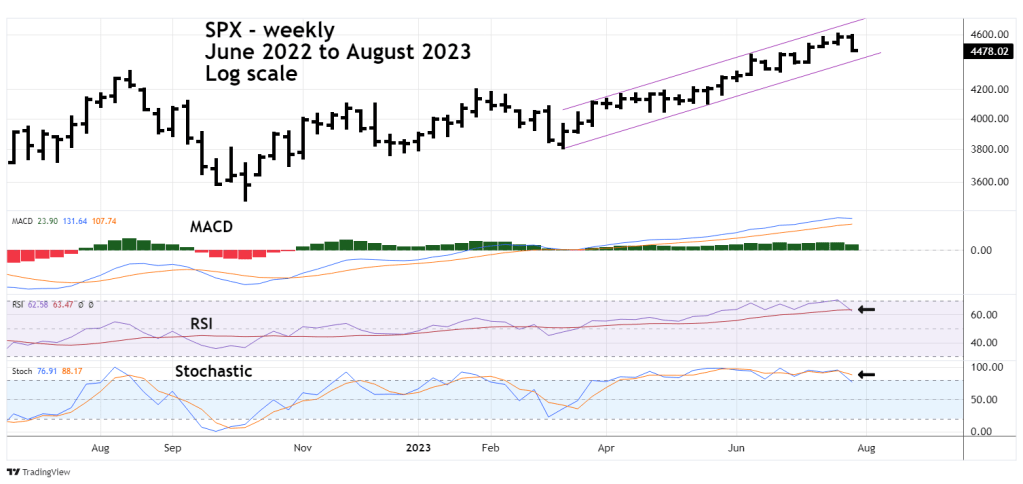The parallel trend channel was drawn from the Trading View tools and is perfect on a Log scale chart. Note that the lower trendline crosses near the area of the early July bottom – around 4,385 to 4,410. This could be at least a short- term support zone.