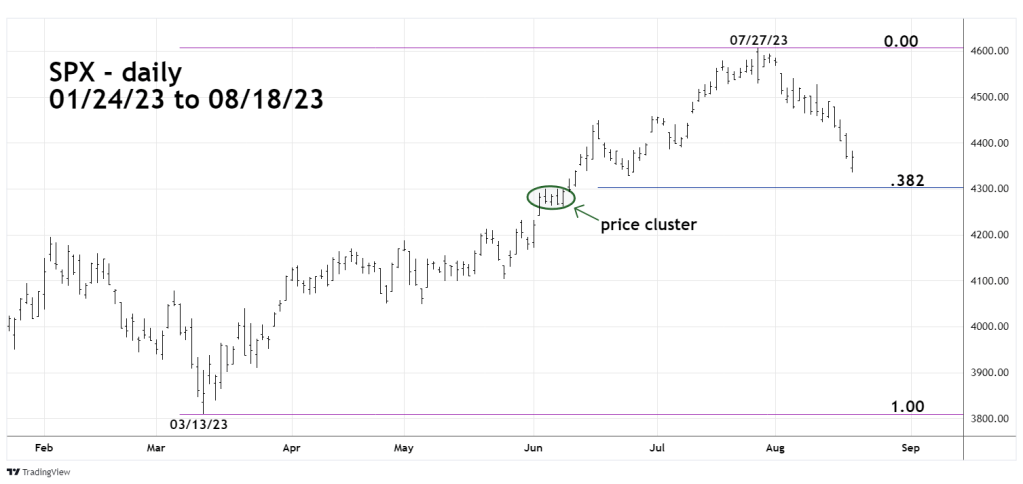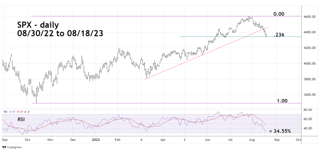 “A Fibonacci .236 retrace of October 2022 to July rally is near SPX 4,350. The SPX closed 08/16/23 at 4,404 and could reach 4,350 on 08/17/23.”
