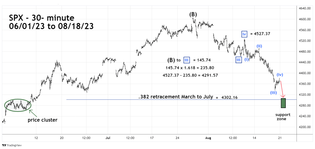 The 30 – minute SPX chart shows additional Fibonacci analysis indicating a short-term bottom could be made near 4,300.