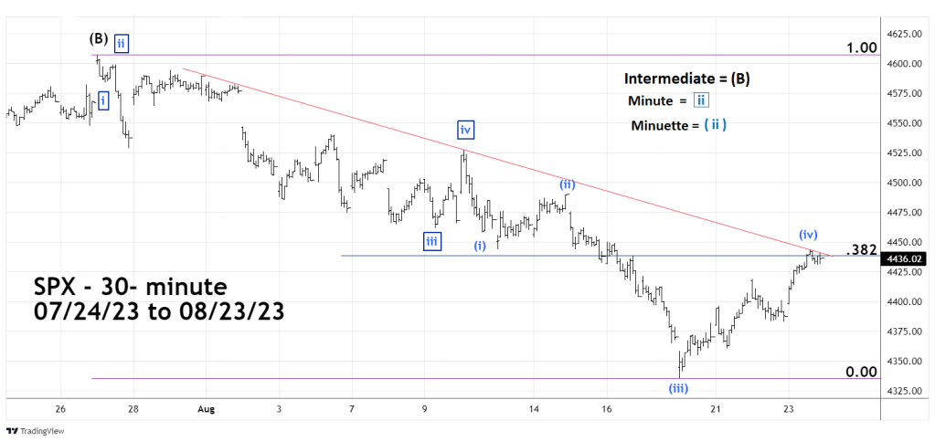 The 08/19/23 blog “S&P 500 First Wave Down Nearly Complete – 08/18/23” illustrated that the S&P 500 (SPX) may have completed Minuette wave (iv) of Minute wave “v” – boxed of the post 07/27/23 decline.