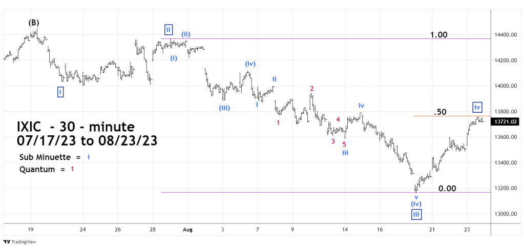 On 08/23/23 IXIC reached a Fibonacci .50 retracement of the presumed Minute wave “3” down and the area of the peak made on 08/14/23. These two factors imply a short -term top may have been made.